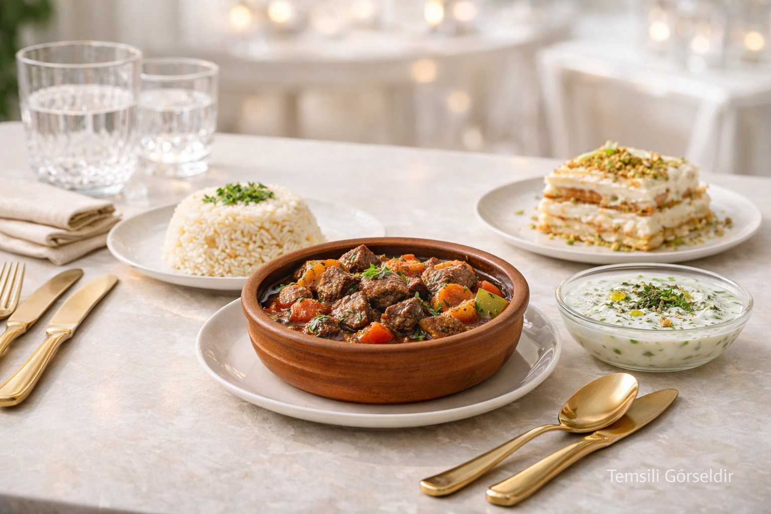 Bu klasik iftar menüsü, Anadolu ev mutfağı geleneğini temel alarak dengeli ve doyurucu bir akış sunar. Protein kaynağı etli güveç, tamamlayıcı karbonhidrat olarak pirinç pilavı, ferahlatıcı bir yan eşlikçi olarak cacık ve hafif sütlü tatlı güllaç ile Ramazan sofralarına uygun bütüncül bir menü oluşturur.