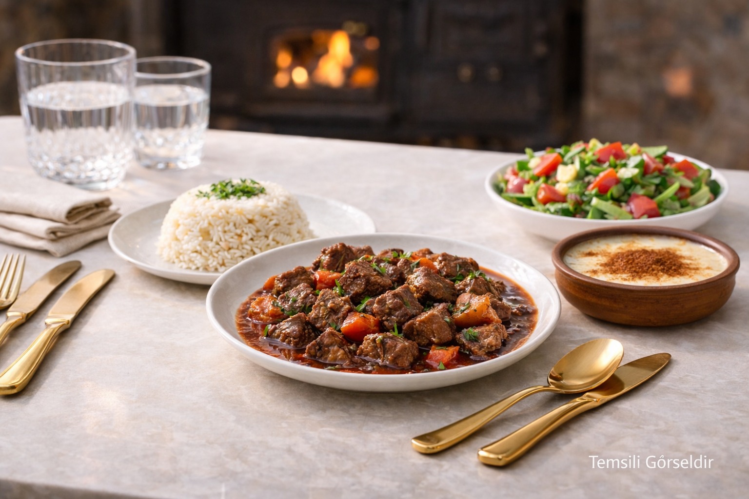 Uzun süre pişirilerek yumuşatılmış dana eti, tane tane pirinç pilavı, ferahlatıcı mevsim salata ve hafif sütlü tatlı ile dengeli ve sindirimi destekleyen bir akış sunar. Menü, Ramazan sofralarında hem besleyici hem de geleneksel bir bütünlük sağlar.